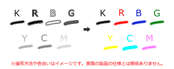 また、画面表示はグレースケールのみの対応ですが、ペンの色自体は実際にはKRBGとYCMに対応。